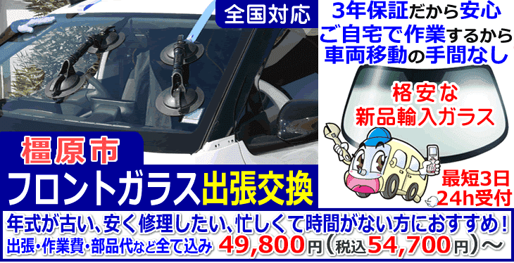 橿原市対応の便利な出張フロントガラス交換は、格安な輸入ガラスの国産車限定ですが、JIS規格適合品で品質保証3年付で車検も問題ありません。