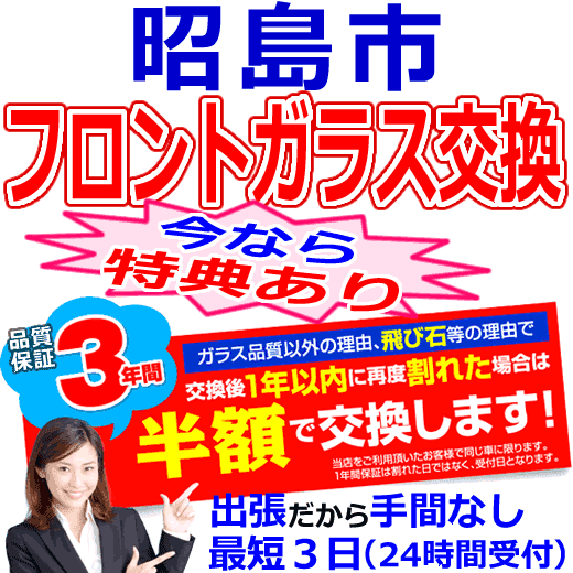 昭島市での出張フロントガラス交換は、格安な輸入フロントガラスへの交換で修理費用を削減できます。昭島市内で自動車や大型トラック、バスのフロントガラス交換修理が必要になりましたら、出張フロントガラス交換サービスのご利用がお勧めです。